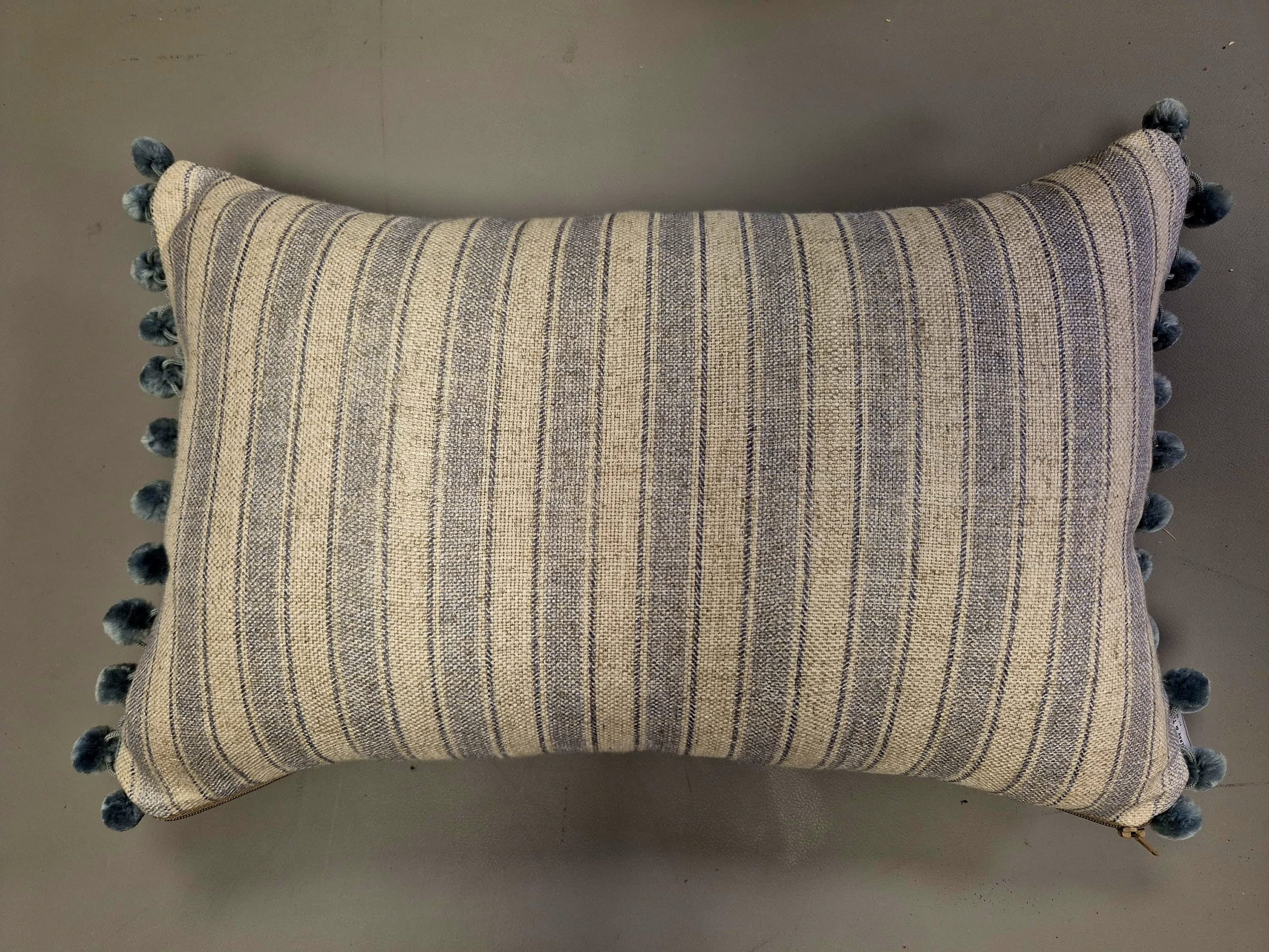 Never unfashionable, this 12 x 18 inch ticking stripe pom pom cushion features coastal vibes with its classic appeal. The light blue stripes are complimented by the grey pom pom trim