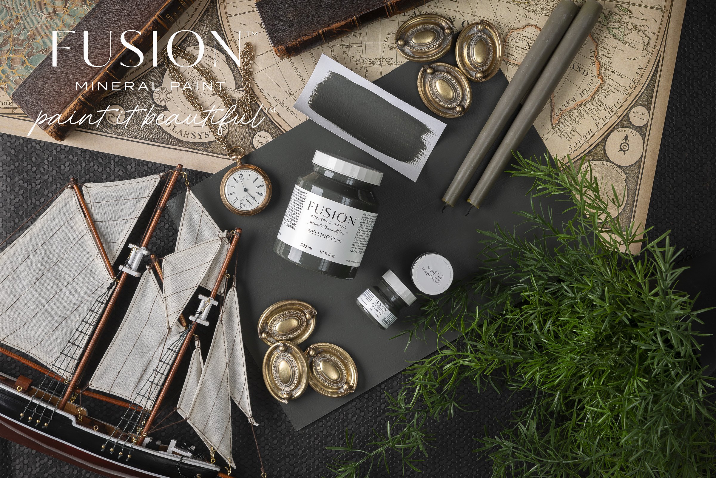 Fusion Mineral Paint’s Wellington is a bold, dark color with balanced green, black, and subtle bronze undertones, creating a sophisticated and dramatic finish. It is a water-based, matte paint that offers exceptional coverage and durability without the need for a separate topcoat. The color is often compared to a deep charcoal or almost-black green and pairs well with colors like Cast Iron or Manor Green for different effects.