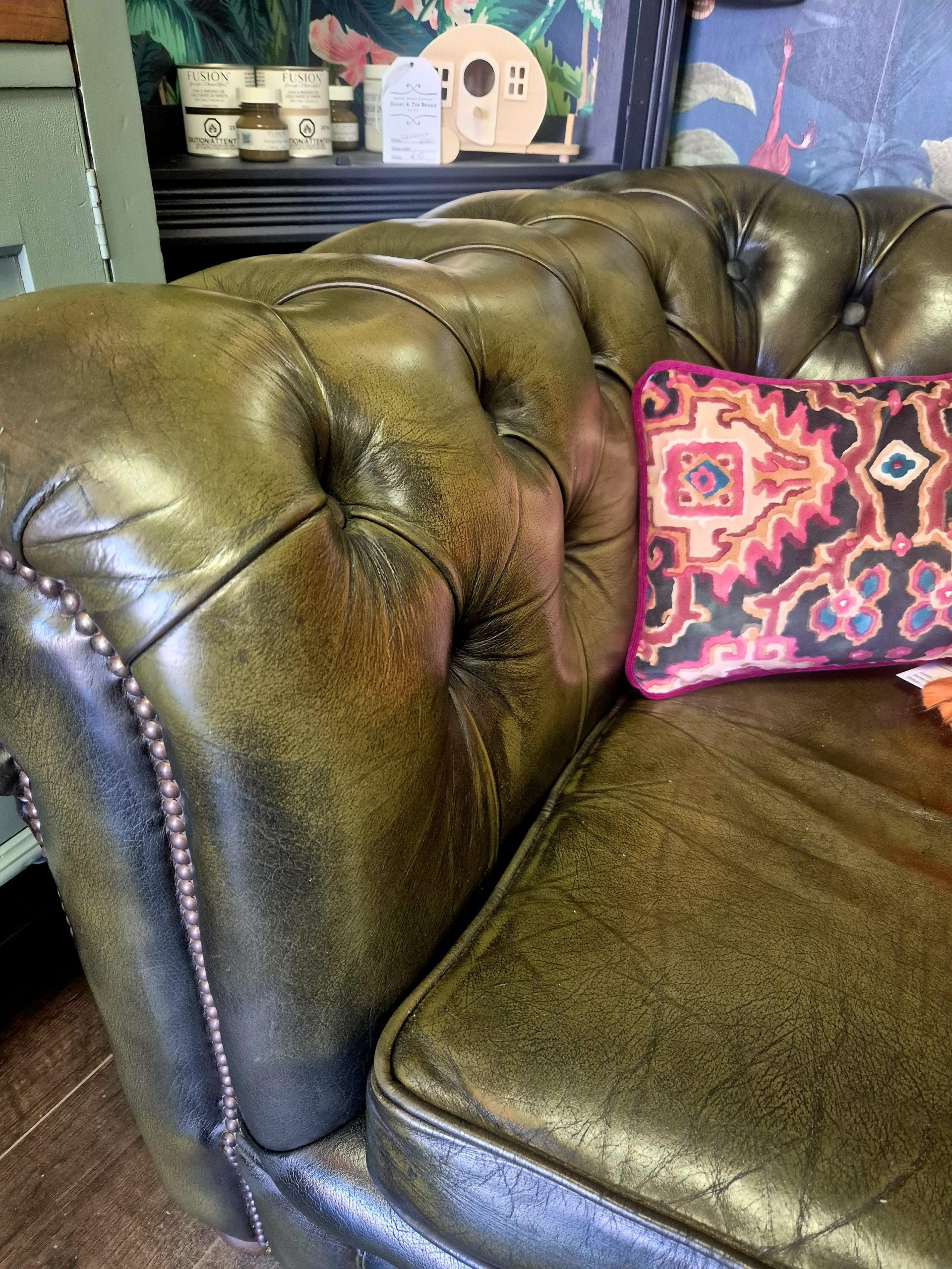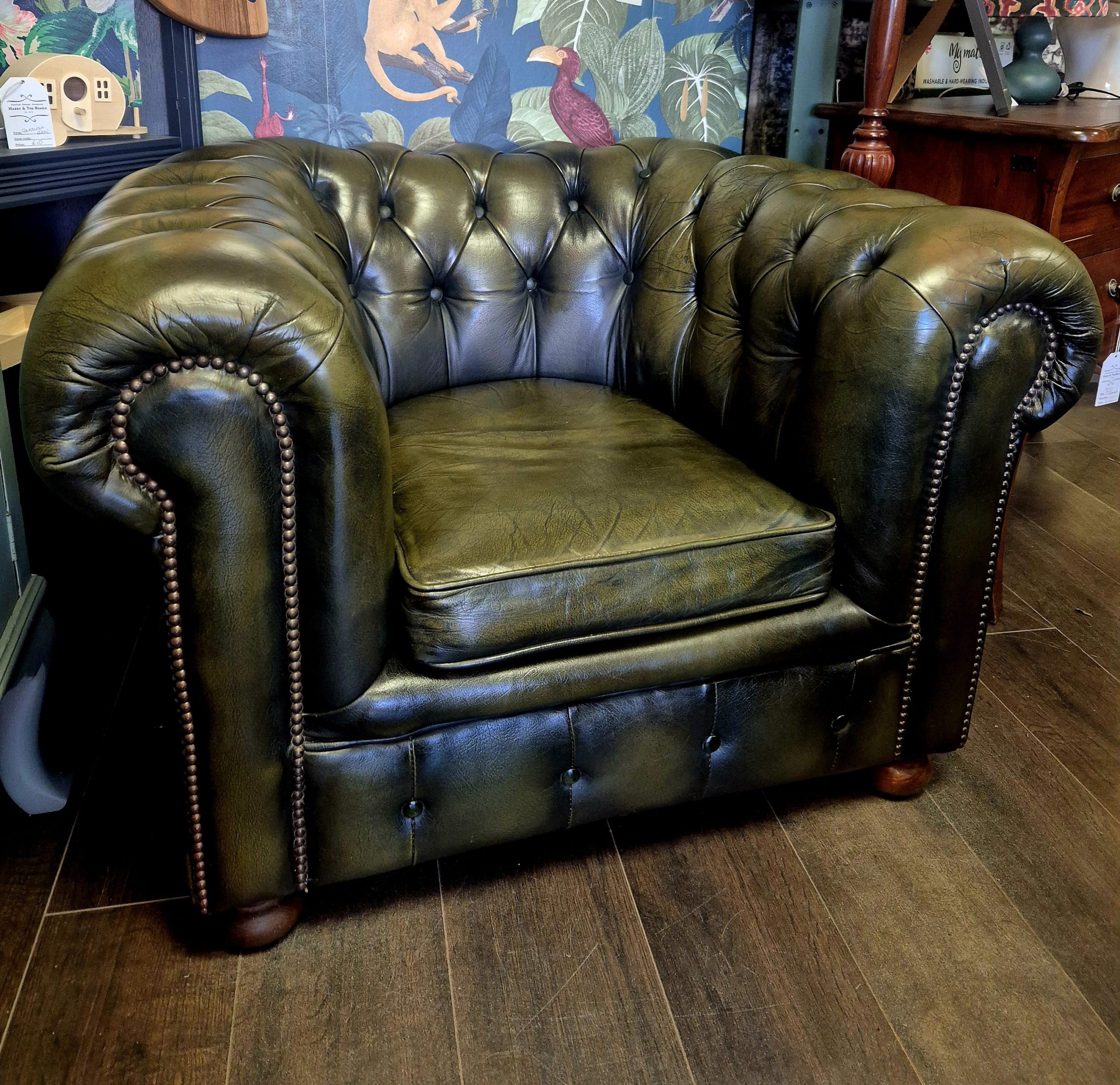 Step into timeless style with this beautifully restored Chesterfield club chair. This classic piece, with its deep green leather and characteristic button-tufted back, has been carefully replenished to bring it back to life while preserving its unique history.