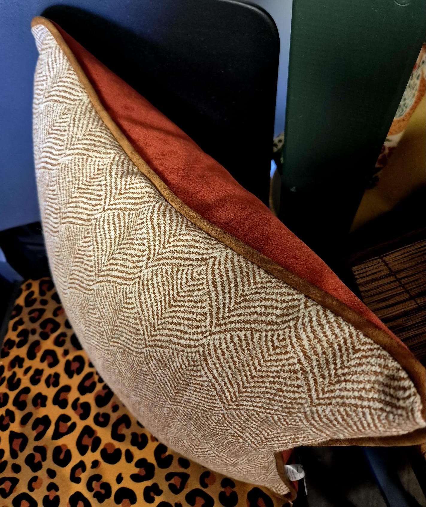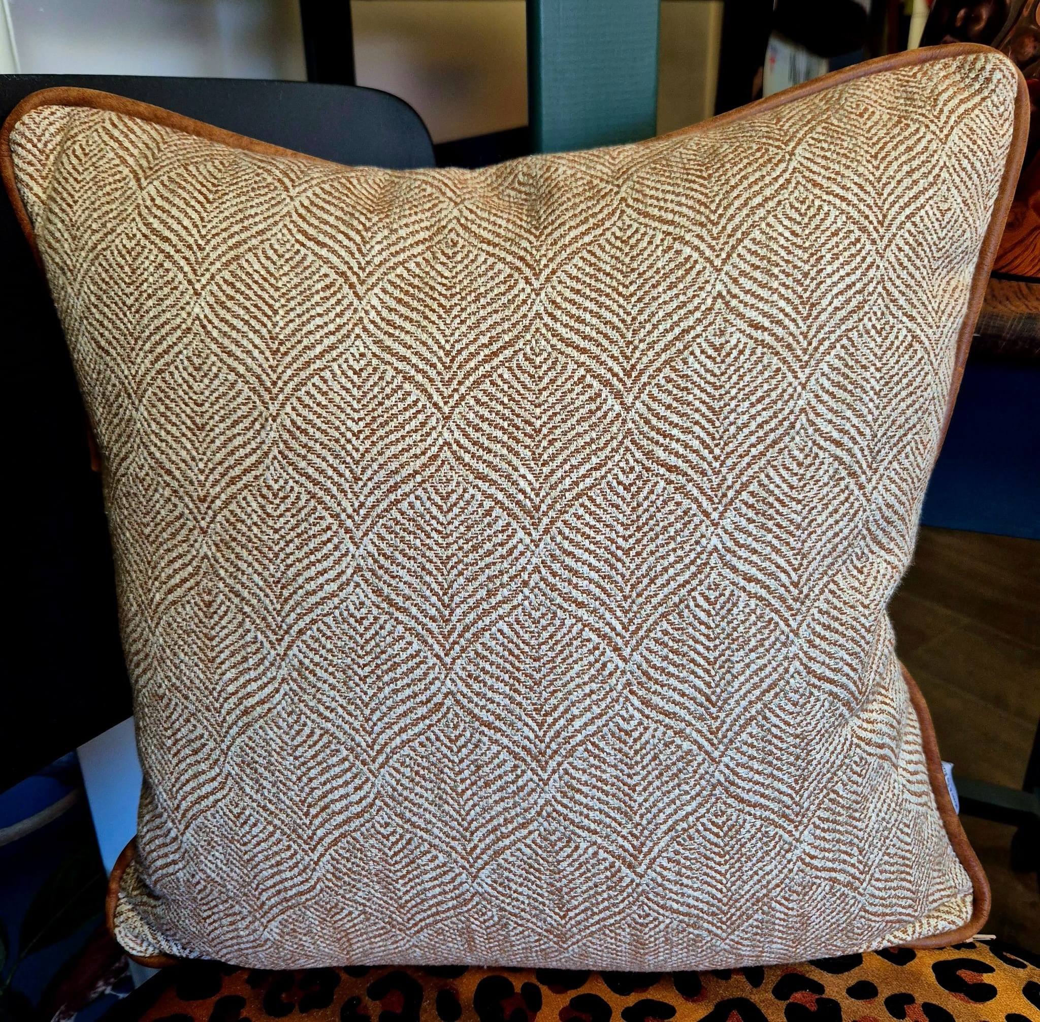 With needlecord clever back and real leather piping. Approximately 16cm square