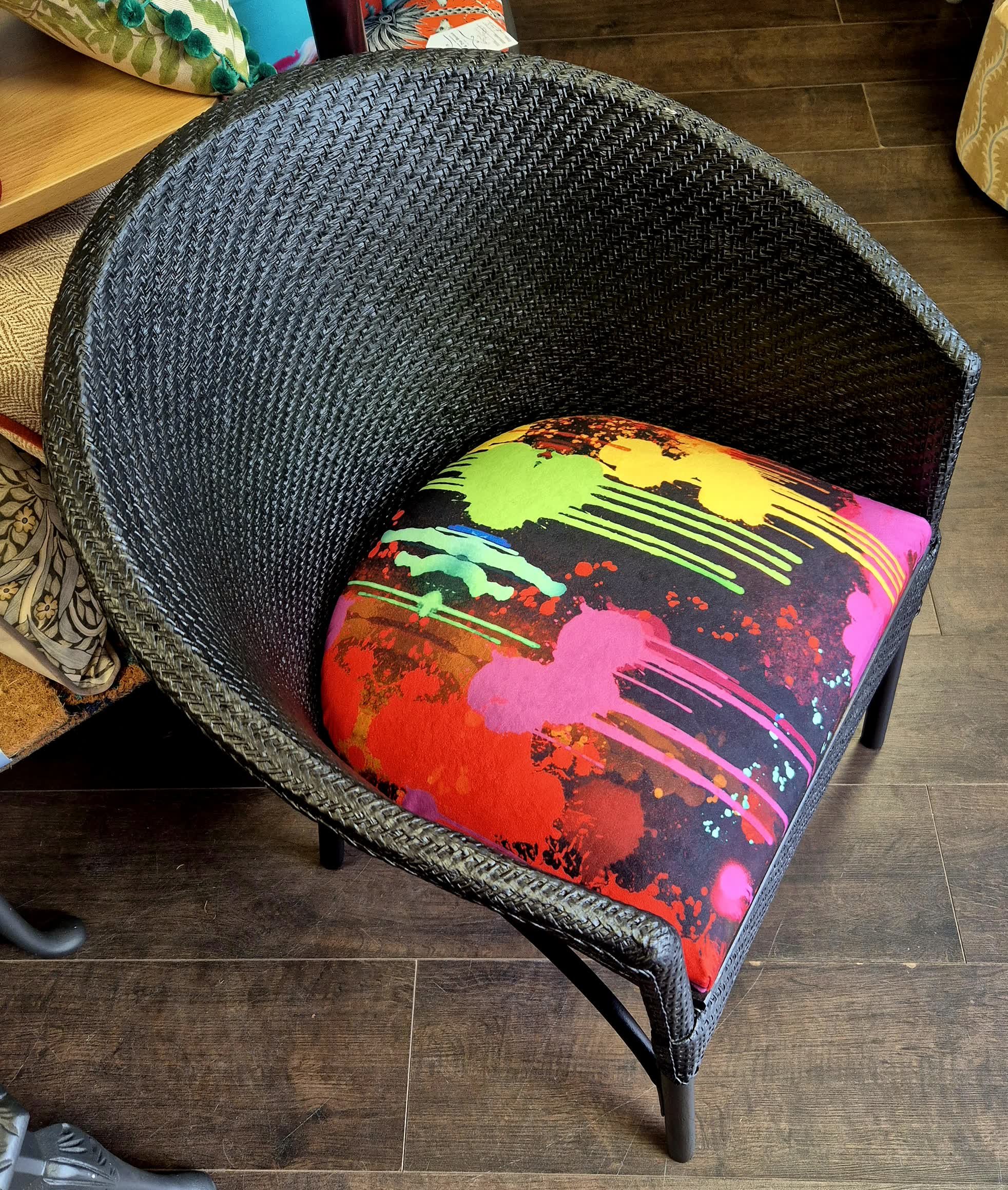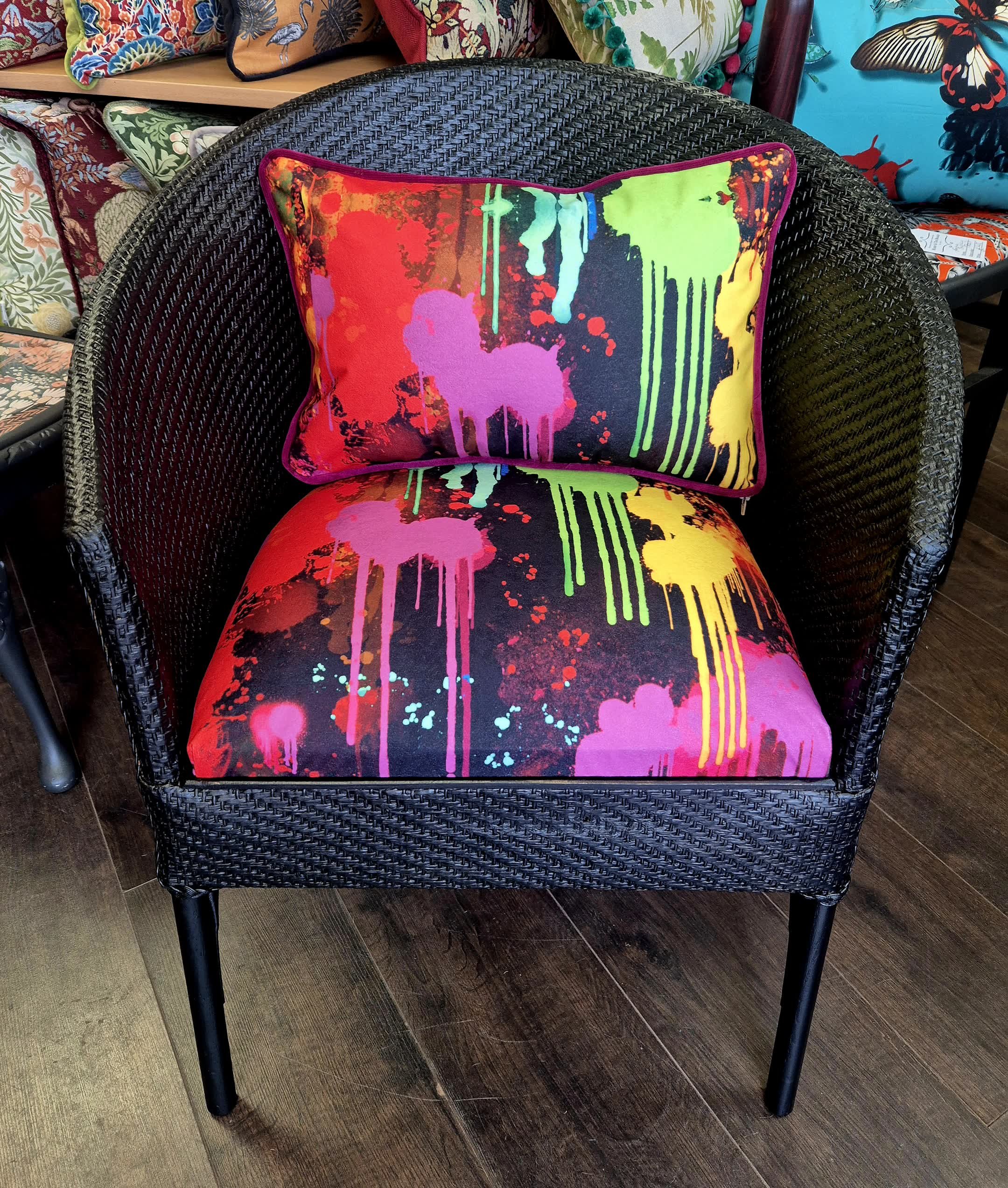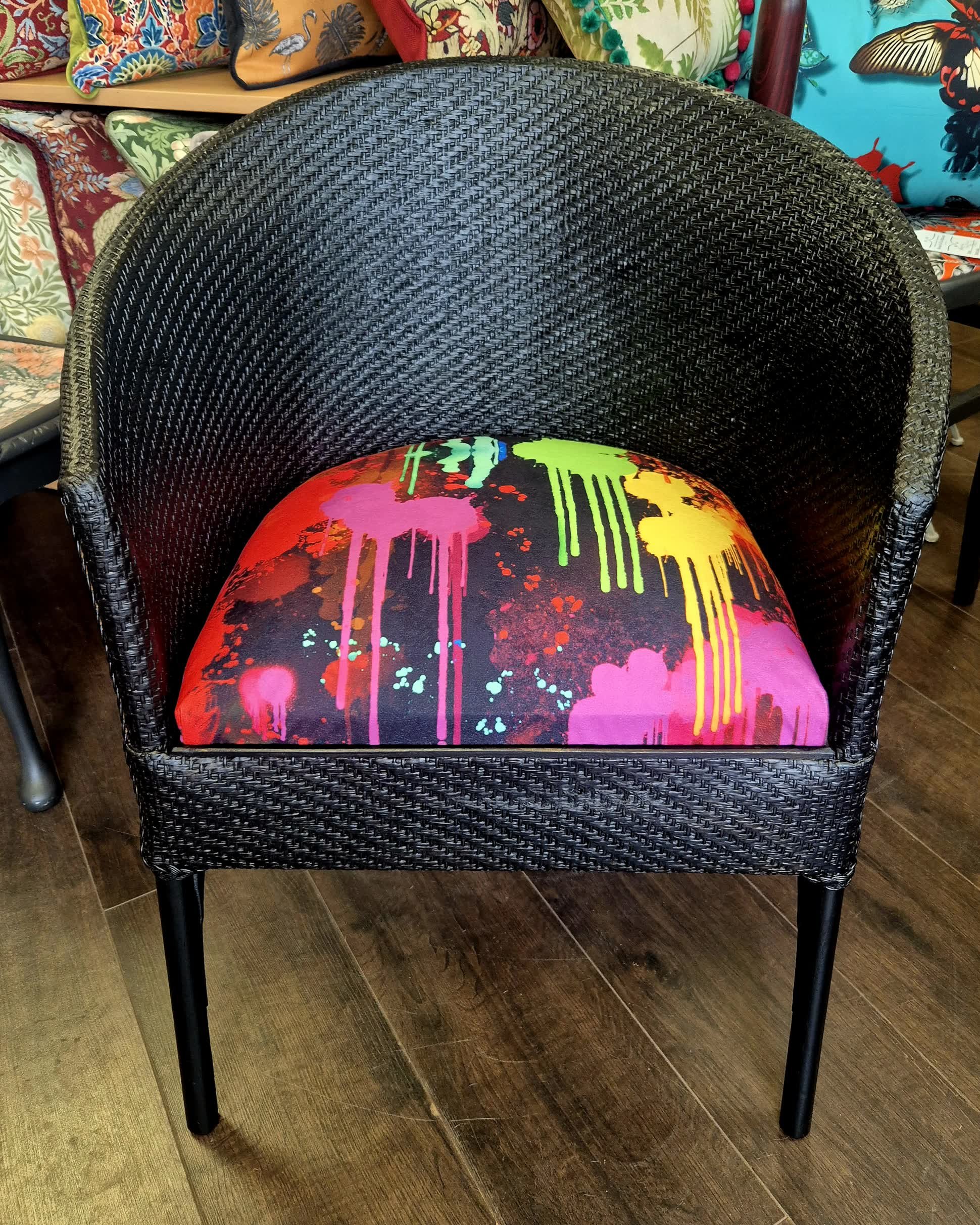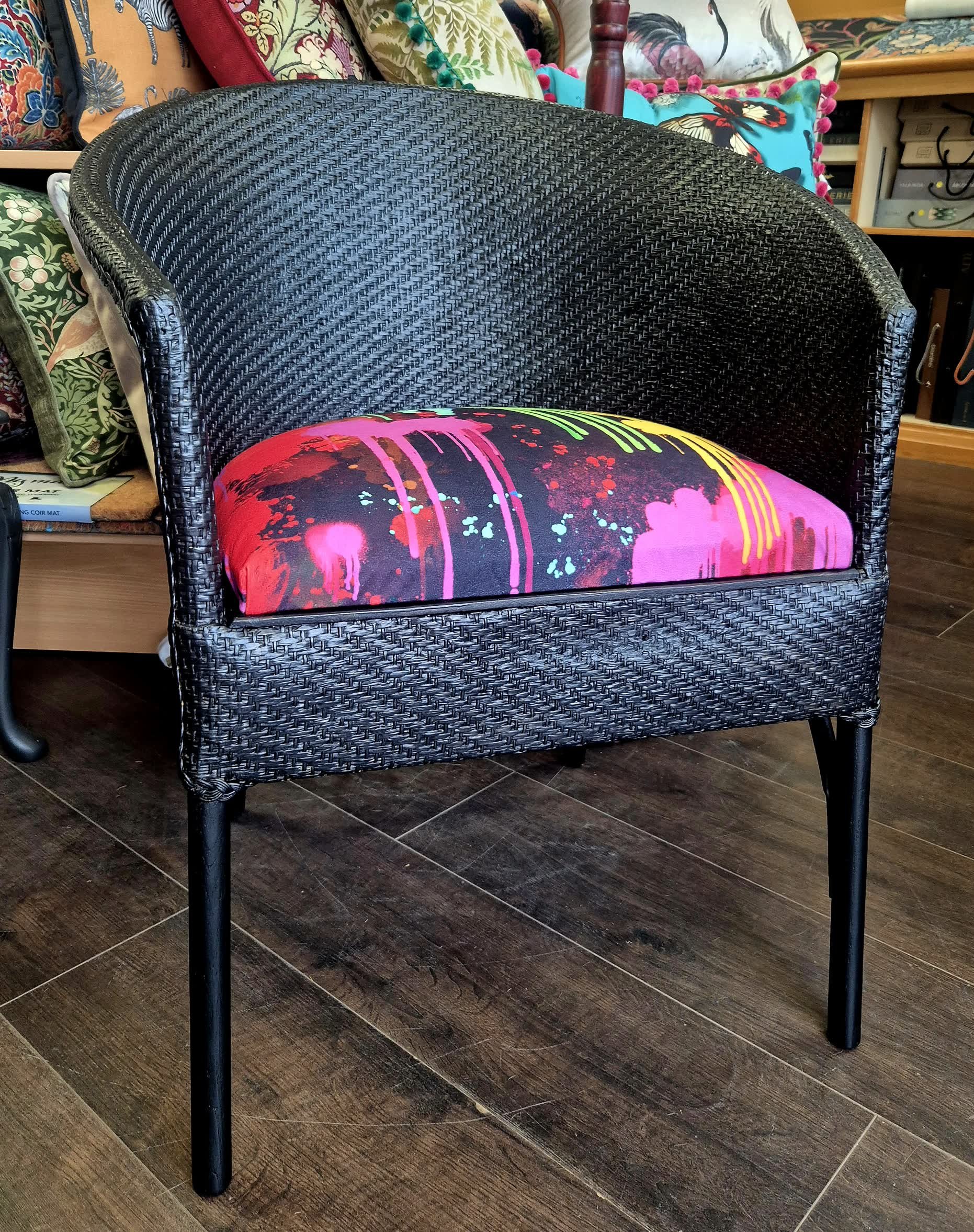The Tempo chair features a comfortable, supportive tub shape and durable, sleek black legs. This contrast in material—the organic texture of the weave against the chair’s striking, solid form—ensures it looks just as commanding against a muted wall as it does a bold, graphic backdrop.