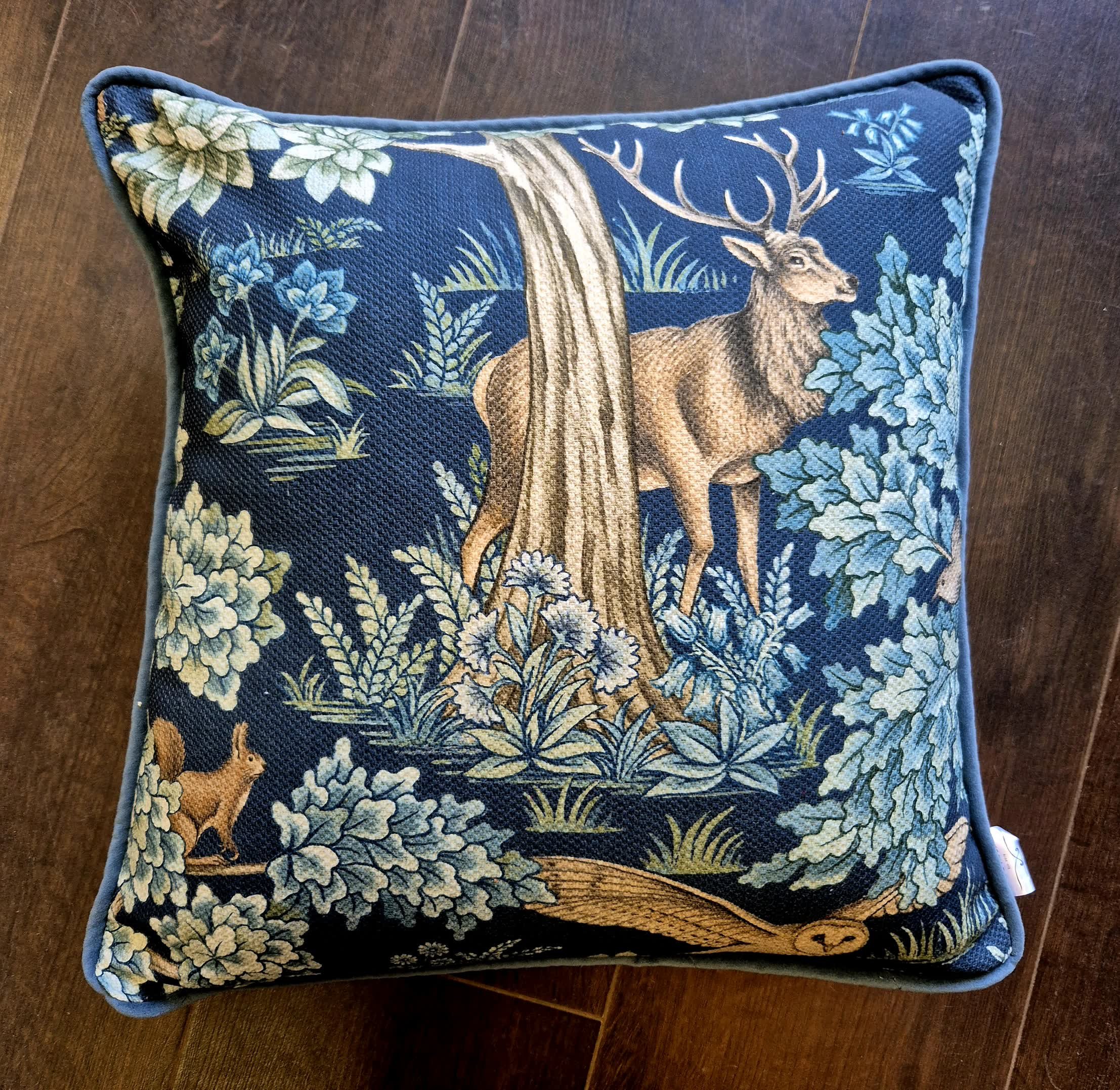 this gorgeous woodland cushion is uniquely made by us to enhance the beautiful pattern with plain powder blue back and piping. It is sure to add charm to any space